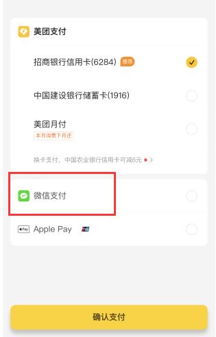 以美团11.14.100版本为例。可以在支付页面选择微信支付,分为以下三步: