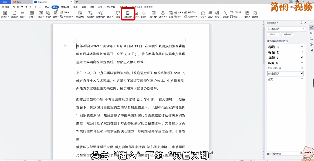 进入wps,打开要插入页眉的文档,将光标放在第一段前,点击“插入”下的“页眉页脚”;