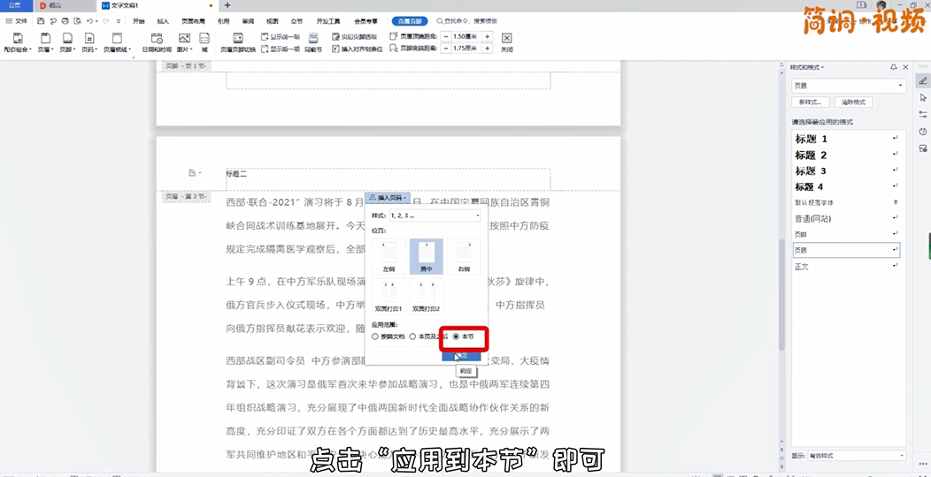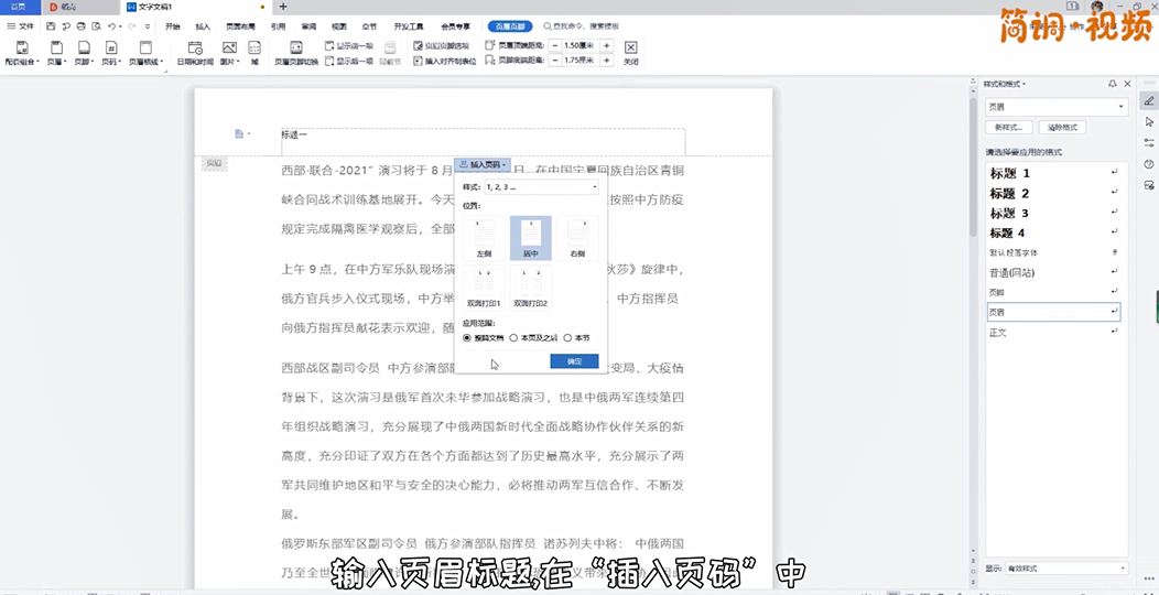 输入页眉标题,并在插入页码中修改样式和位置。在应用范围中,单击“应用于整个文档”,双击文档的空白处显示效果。