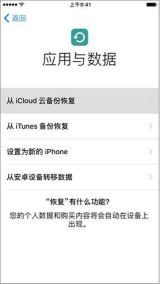 打开电话设置,单击常规,单击恢复,然后单击抹掉所有内容和设置以重新激活电话。在“应用到数据”界面选择“从iCloud云备份恢复”,然后登录Apple ID,选择要恢复的备份数据。注意,这种方法的前提是先把手机恢复出厂,恢复出厂后手机上的所有数据都会丢失~
