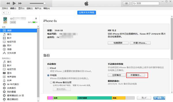 iTunes是苹果公司开发的一款iPhone软件,通过它我们可以备份手机中的照片以备不时之需,所以删除视频后可以从ITunes备份中恢复。操作如下所示: