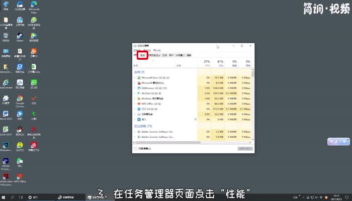 3.单击任务管理器页面上的“性能”;