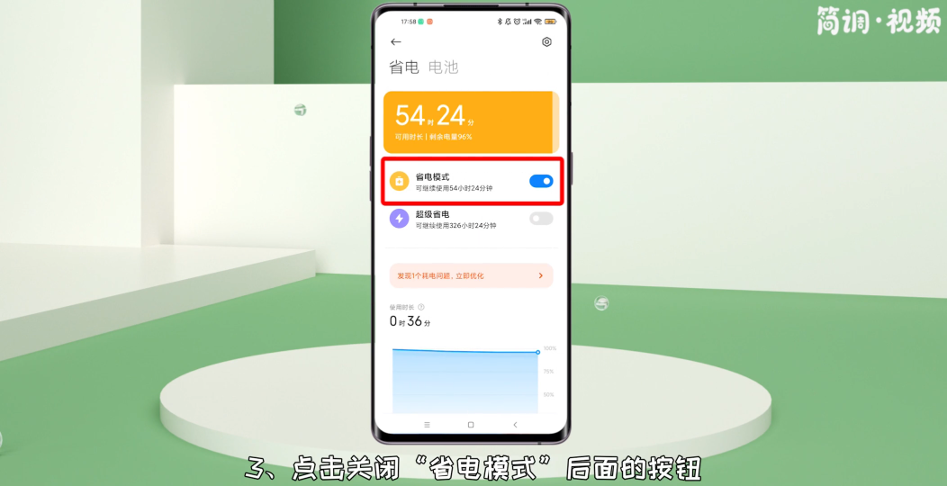 3.点击“省电模式”后面的按钮,关闭省电模式,电量颜色恢复正常。