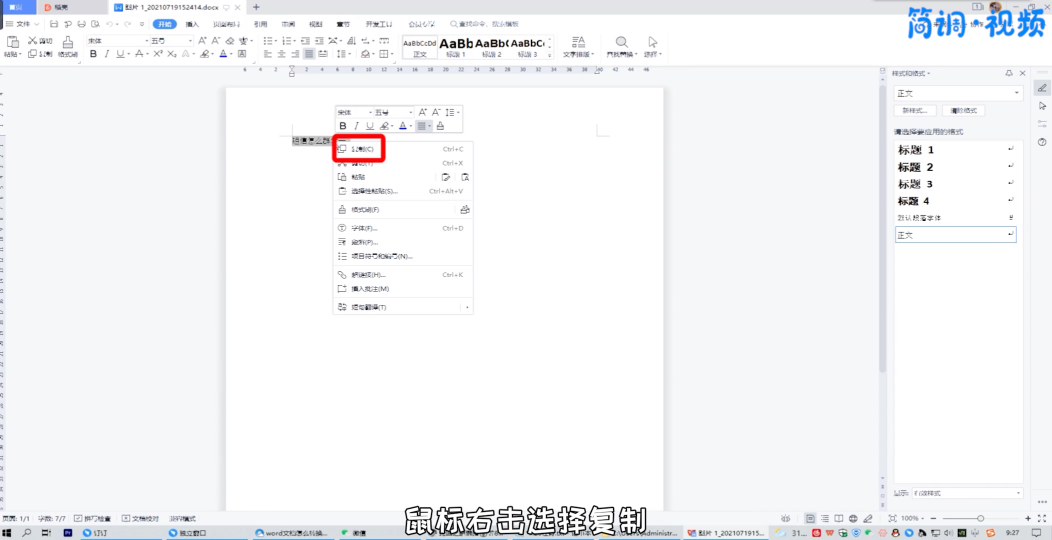 1.这里以WPS为例。打开需要转换成JPG格式图片的文档,选择文本,点击鼠标右键选择复制;
