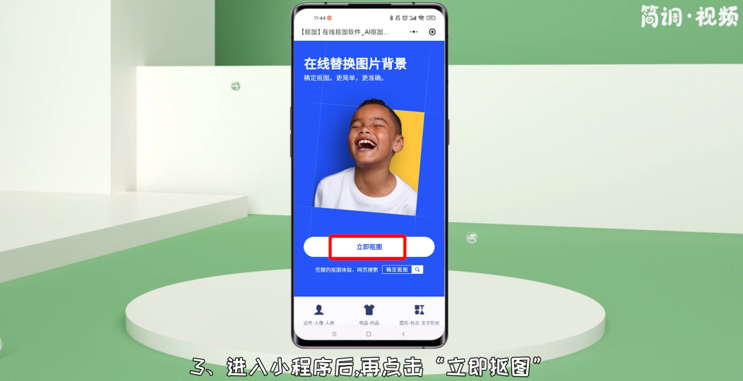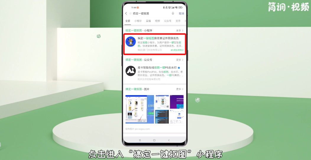 2.在弹出的搜索界面,点击进入“获取一键抠图”小程序;