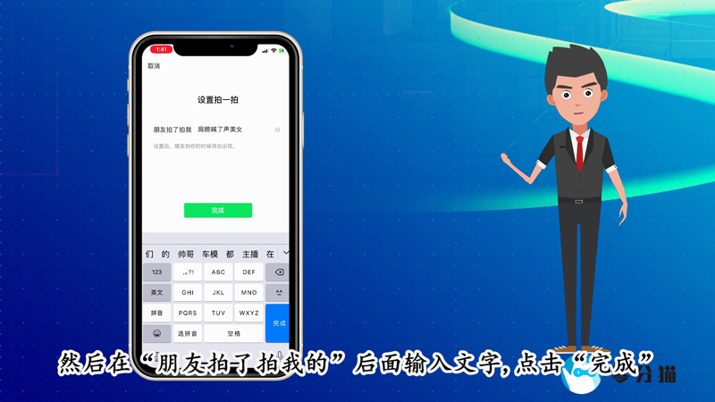 输入“我的朋友拍拍我”后的文字,点击“完成”。别人拍我的时候会有提示。