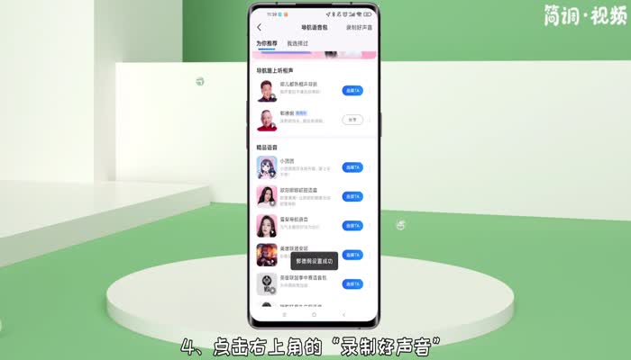 4.点击右上角“录制好声音”。进入后根据字幕提示录音,可以录制自己的导航声音。