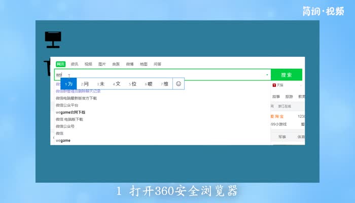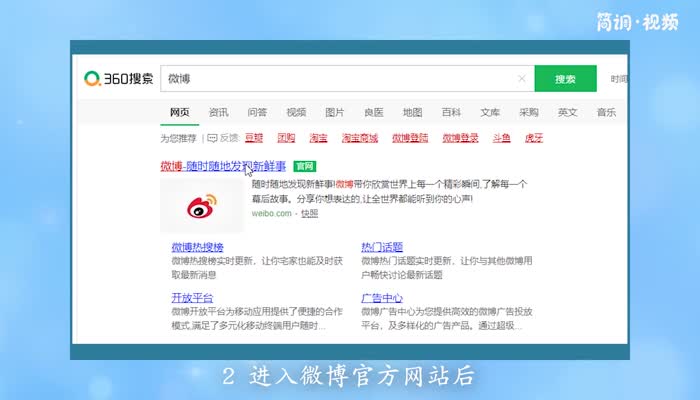 1.打开360安全浏览器,在搜索栏输入“微博”,点击搜索;