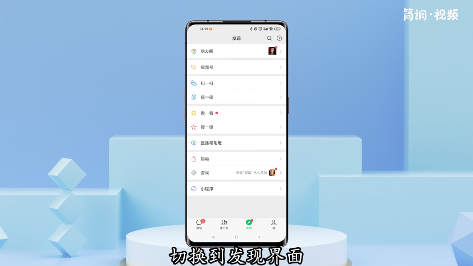 1.打开微信,切换到“发现”界面,点击进入“视频号”界面;