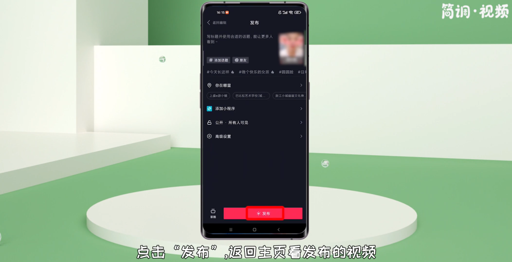 5.在“发布”界面,编辑文字、位置等参数,点击“发布”,返回首页观看发布的视频。可以看到用过的道具都是隐藏的。