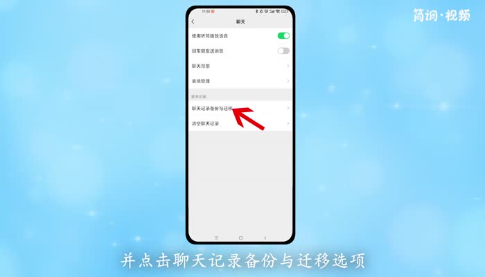2.在设置界面,点击进入“聊天”界面,点击“聊天记录备份和迁移”选项;