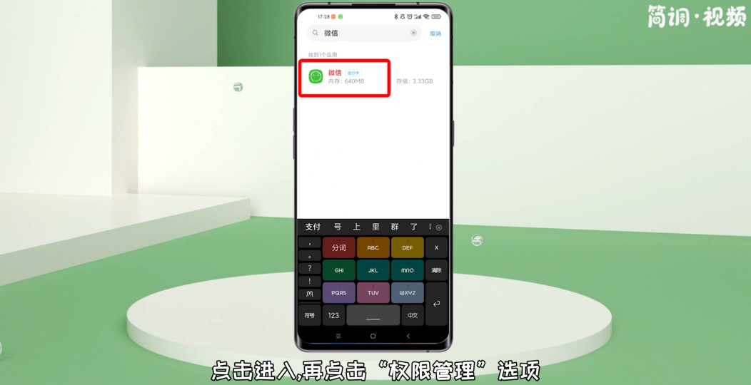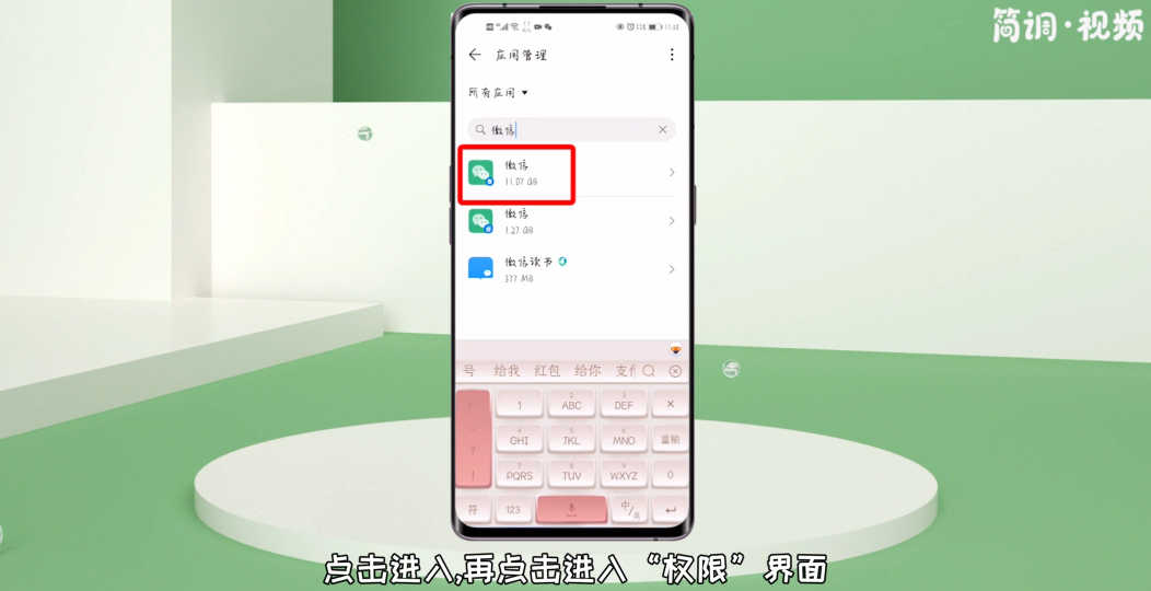 3.在应用管理中,找到“微信”,点击进入,再点击进入“权限”界面;