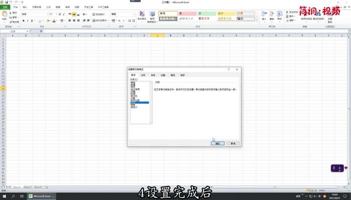 3.在设置单元格格式的弹出窗口中选择“文本”,最后点击确定;