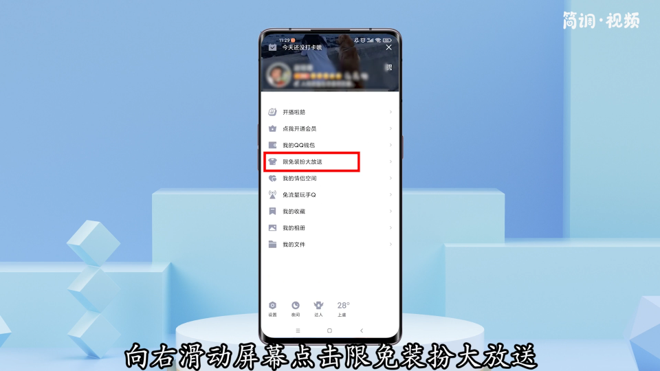 1.打开手机qq,向右滑动屏幕,点击“自由穿衣大玩”,进入个性化穿衣界面;