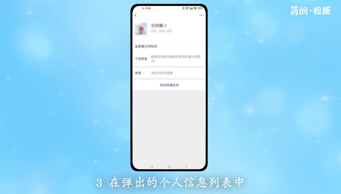 3.在弹出的个人信息列表中,点击“添加到通讯录”。发送添加和设置好友评论的申请后,点击“发送”,等待好友同意申请后,再重新添加好友。