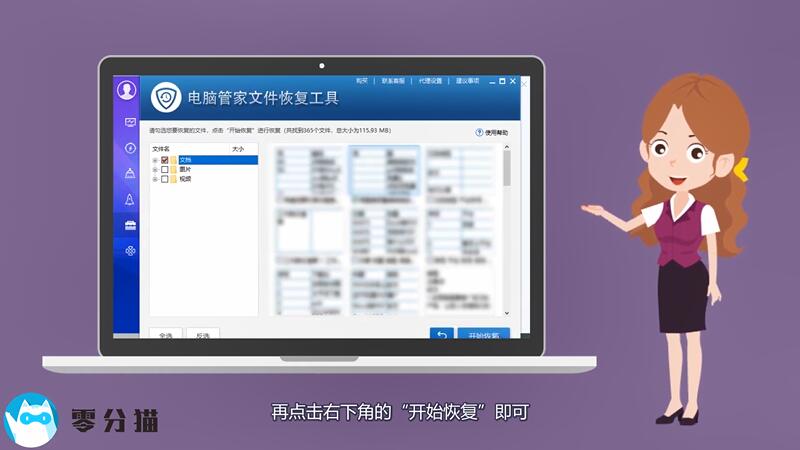 4.工具扫描完成后,选择要恢复的类型,如“文档”,勾选后点击右下角的“开始恢复”。
