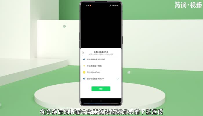 进入“收付款”设置界面后,在切换后的界面中点击优先付款方式下拉选项,然后根据自己的需要选择付款方式,点击确定即可。
