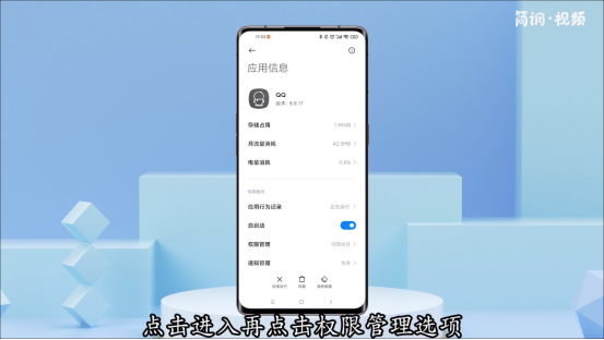 3.在应用管理中,找到“qq”,点击进入,再点击进入“权限”界面;