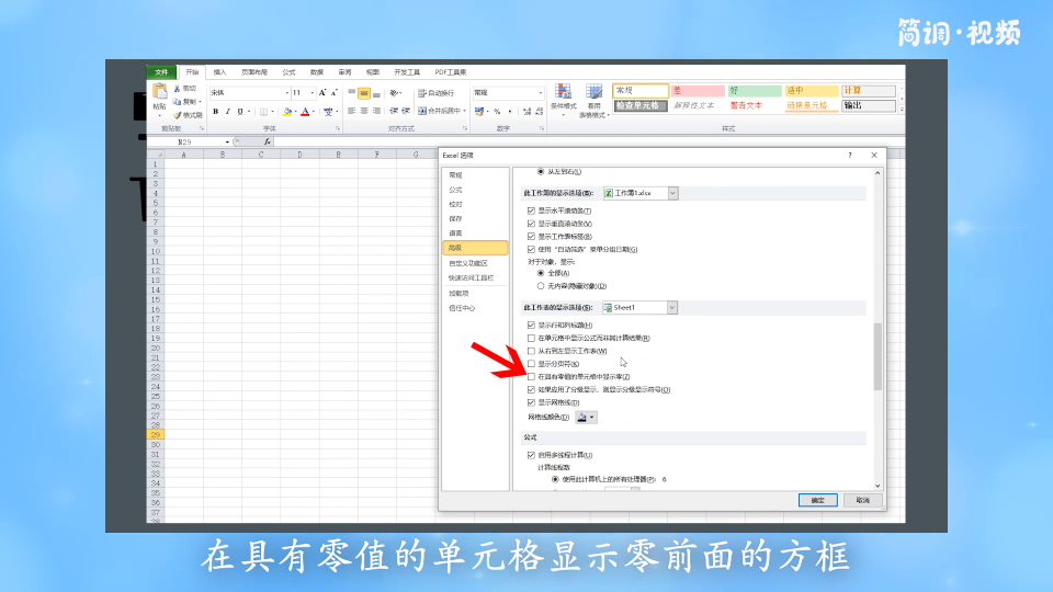 5.在“此工作表的显示选项”一栏中,找到并单击“在有零值的单元格中显示零”前面的框,打勾,最后单击“确定”。