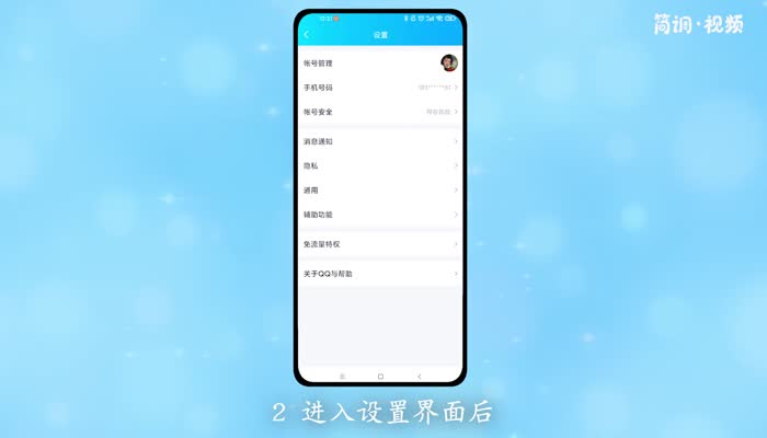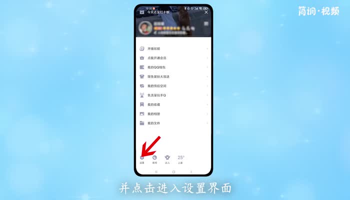 1.打开手机qq,向右滑动屏幕,点击进入“设置”界面;