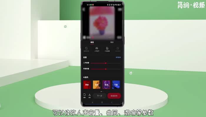 3.进入后可以修改自己唱的歌。在“调音”界面,您可以修改音量、风格、混响等参数。