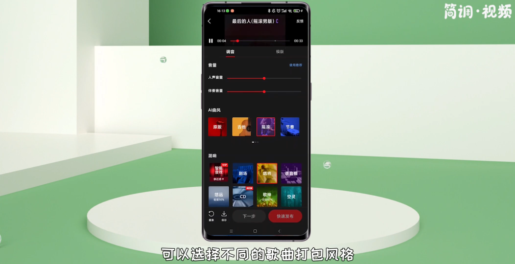 4.在“模板”界面,你可以选择不同的歌曲包装风格。设置完成后,点击“快速发布”。