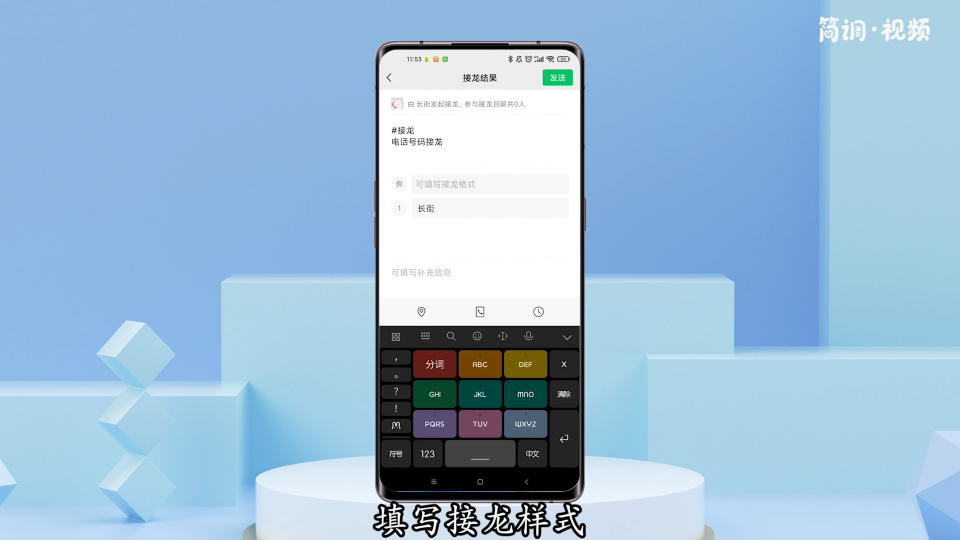 4.填写完毕后,点击右上角的发送,将接龙发送到群聊中。群成员点击参与接龙后,可以填写接龙信息。
