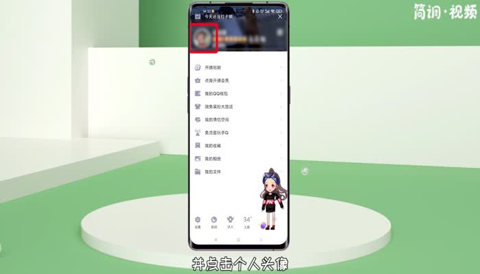 1.打开手机qq,向右滑动屏幕,点击个人头像;