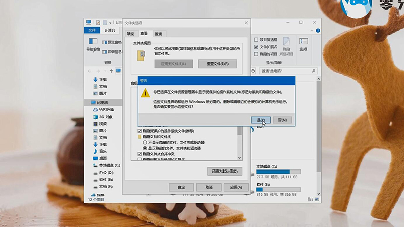 如果要查看系统隐藏文件,可以去掉隐藏的受保护操作系统文件前面的勾号(推荐),弹出警告窗口,点击是。