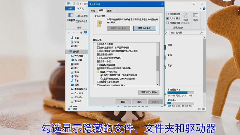 选择查看,下拉查找隐藏的文件和文件夹,并选中显示隐藏的文件,文件夹和驱动器。