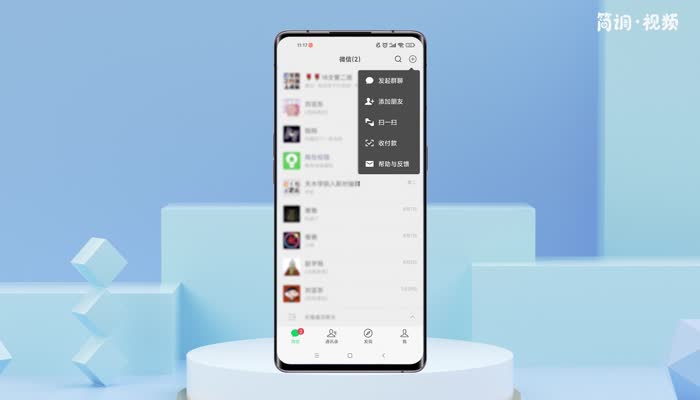 1.打开手机微信,切换到“微信”界面,点击右上角的“”;