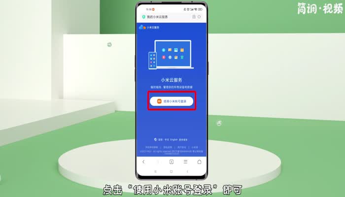 打开手机浏览器,输入“小米云服务官网”,在弹出的界面中输入“我的小米云服务”官网,根据系统提示点击“使用小米账号登录”。