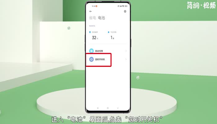 进入“电池”界面后,点击“定时开关机”,打开“定时关机”按钮。