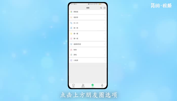2.进入发现页面后,点击上方的“朋友圈”选项,进入朋友圈页面;