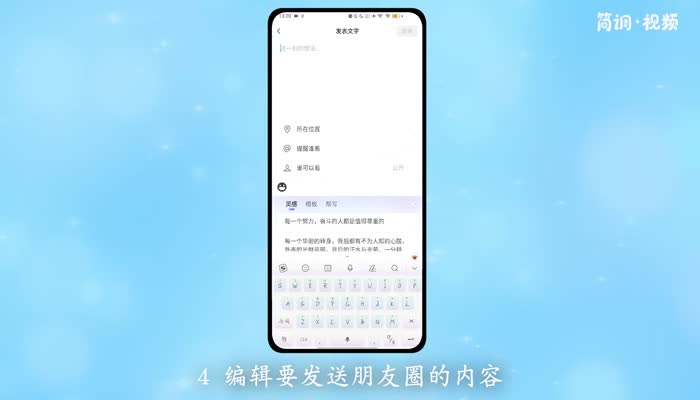 4.编辑要发送到朋友圈的内容,然后点击下面的“哪里”;