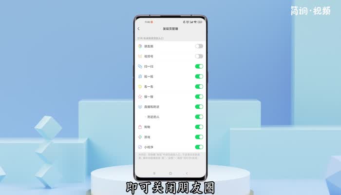 4.在“朋友圈”选项中,点击关闭后面的按钮,关闭朋友圈;
