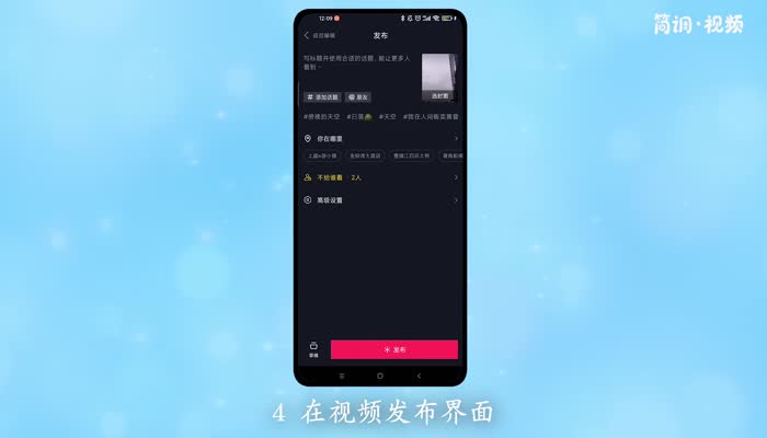 4.在视频发布界面,输入标题,添加话题等。然后点击“发布”返回到我的页面,可以看到作品再次上传成功。