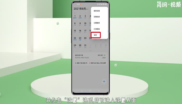 2.在日历界面,点击右上角的三个点,点击“设置”选项,进入设置界面;