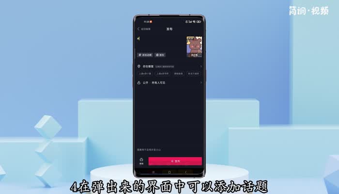 4.在弹出的界面中,可以添加主题、位置等。设置完成后,点击“发布”。