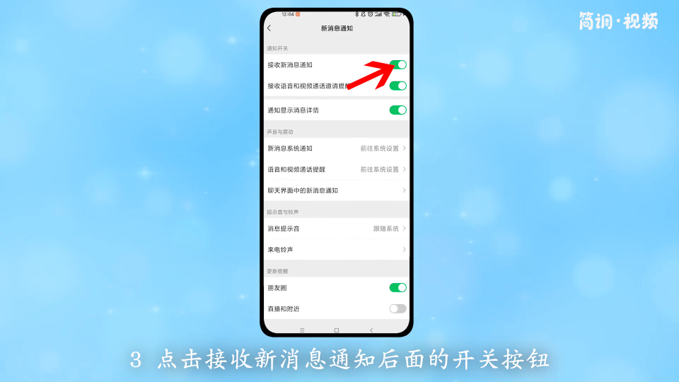 3.点击“接收新消息通知”后面的切换按钮,打开微信的消息通知。