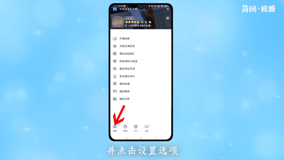1.打开手机qq,向右滑动屏幕,点击“设置”选项;