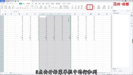 3.单击开始菜单栏中的“行和列”,然后单击隐藏和取消隐藏选项;