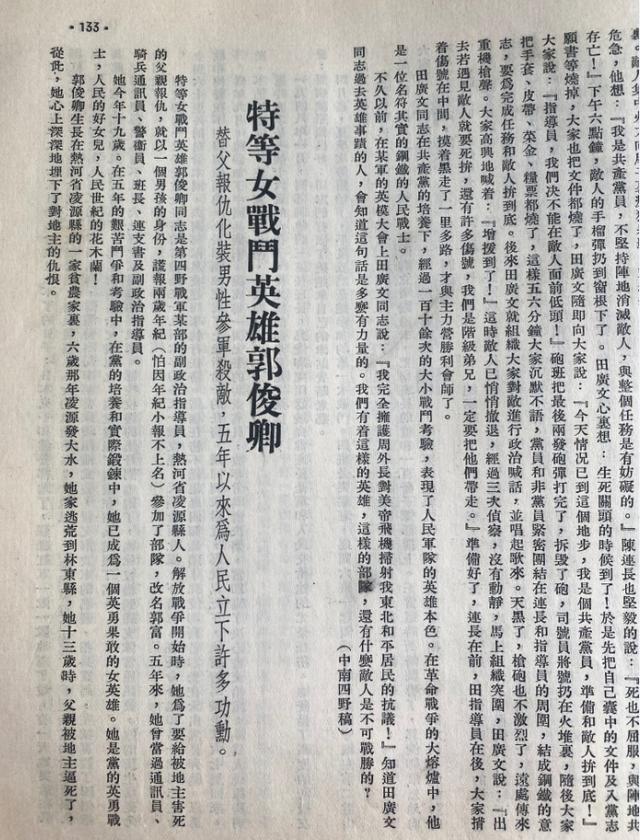 郭俊卿(女) 热河省凌源县人,中南军区第四野战军副政治指导员,19岁。她历任警卫员、骑兵通讯员、班长、副支书,与男同志并肩作战五年,荣获 全国“女战斗英雄”称号。