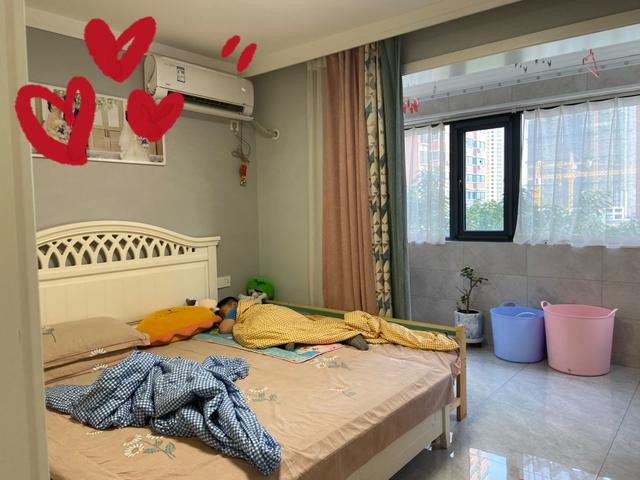 主卧与生活阳台打通,显得空间更大了,室内采光更通透。布置了一张双人大床,床的尺寸很大,家里小孩都在很舒服的睡觉中,很会享受啊。床头墙上挂着婚纱照,满满都是幸福的味道。不过,床头墙上安装空调去,其实这点不好哈,还没装修的朋友,注意这点小细节。