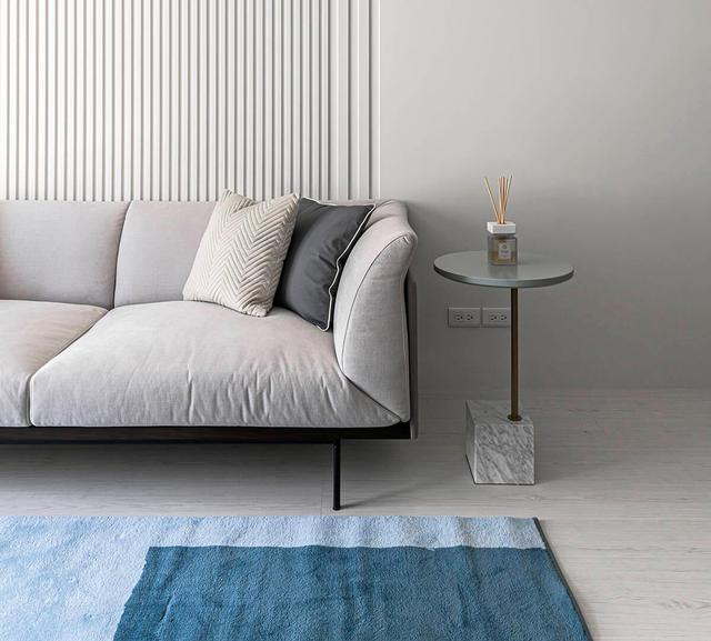 客厅不大,是一个三面墙环绕的空间。中间区域放置沙发,模块式沙发可以拆成两个单人沙发来使用。