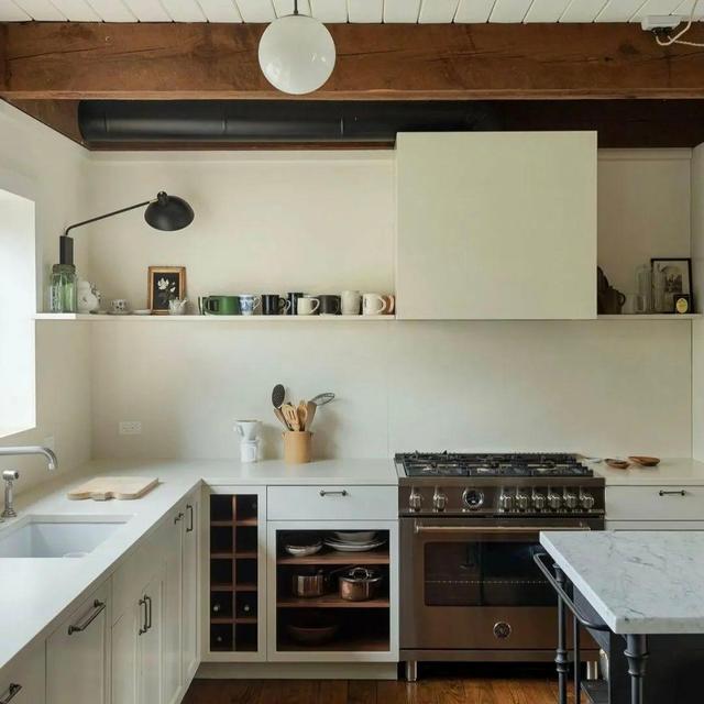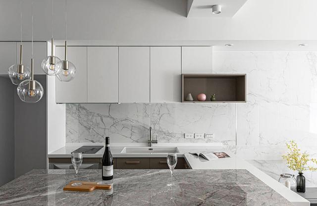 ①厨房餐厅二合一,结合吧台做成u型布局,超大的操作台用起来会更爽;
