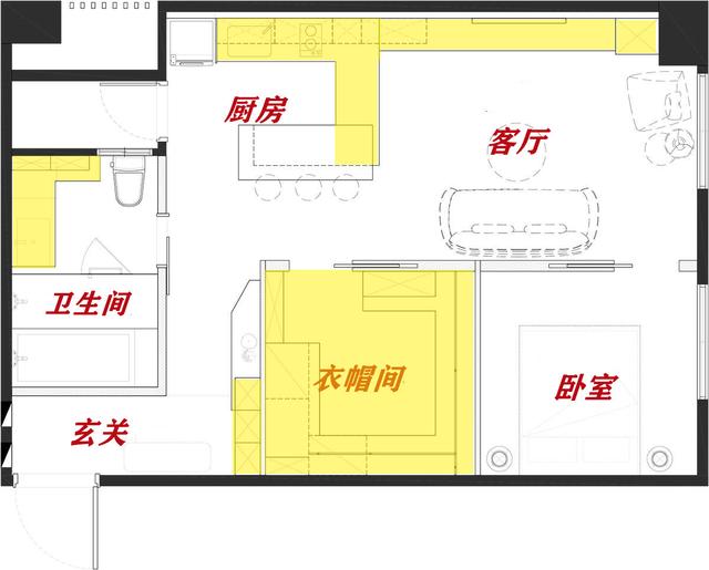 户型图在这里,大家酌情做个参考,黄色标识部分为储物空间。