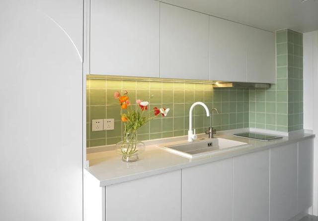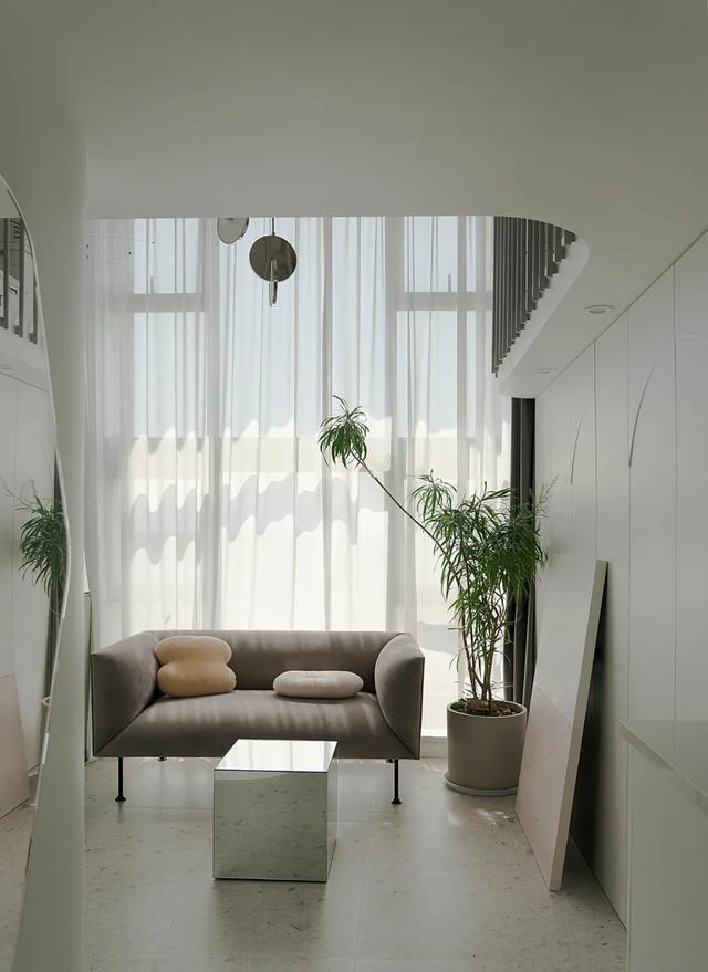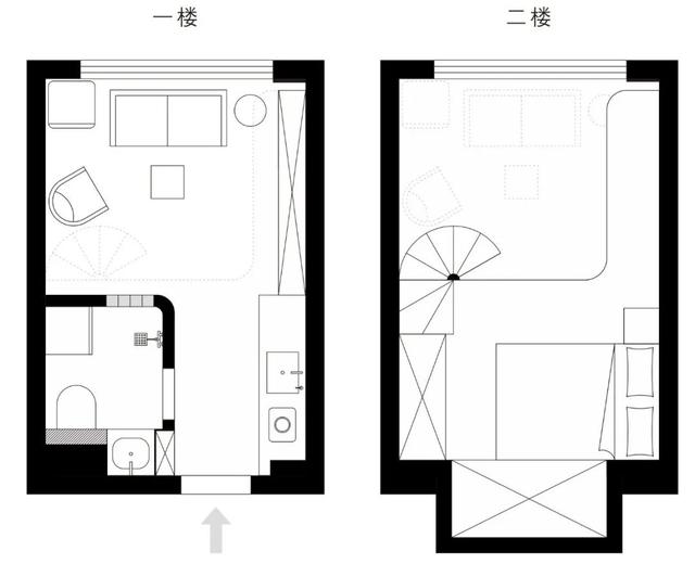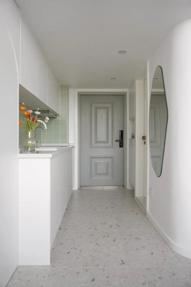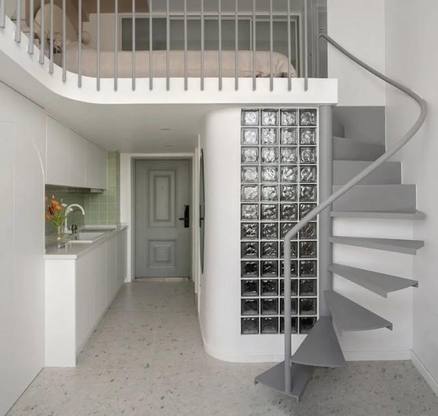 毛坯 毛坯 平面布置图 平面布置图- 这套房子是开间的格局,里面除了大门左侧预留的下水位置外,其他啥也没有,站在门口,便能一眼望得到阳台。这样的房子,虽然不适合一大家子住,但作为单身公寓,或者作为个人工作室的话,我觉得挺适合的。 - 设计师利用层高优势,将它隔成了两层,一层是客餐厨卫,二层是卧室。这是loft公寓的常规设计,并算不得稀奇,但如何设计,才能在满足这些功能的基础上,还能让室内各个空间都能尽可能地显敞亮,却需要有自己的思路。来看看设计师是怎么做的吧!  入户 入户- 在家居装修的几大要素中,色彩占据着非常重要的位置,它往往决定着人们对它的第一印象,在小户型空间里,运用纯色与浅色来铺陈,能让空间看起来更明亮更宽敞。这套房子的主色调,便是采用的纯白色与浅灰色,因而一进门,便给人非常清爽敞亮的视觉印象。  入户 入户- 在空间布局上,设计师保留了客餐厅的原始高度,而将卧室架于活动频率相对较低的厨卫和过道区的顶上,如此一来,既满足了实际生活需要,又拥有了一个开阔敞亮的客餐厅。  厨房 厨房 厨房 厨房- 厨房位于大门右侧,由纯白色的橱柜与浅绿色的墙面相搭,显得十分地清新雅致,吊柜下方还嵌入了灯带,将操作区周围衬得明亮又温暖,提升了烹饪体验。  卫生间 卫生间 卫生间 卫生间 卫生间 卫生间- 卫生间里没有窗没有光,总是很让人痛苦的,所以设计师将朝向阳台的这面墙换成了玻璃砖,将卫生间的门,也换成了长虹玻璃的,如此一来,极大地改善了卫生间的采光问题,再加上卫浴区内配色很淡雅,所以,内部整体效果很敞亮。 - 划分卫生间的时候,设计师特意在门口位置留下了放置鞋柜的空间, 墙面上还挂了一面镜子,所以,玄关功能也很齐全。  客厅 客厅- 居家生活总是离不开储物空间的,这套房子虽然很小,但储物容量却不容小觑,设计师将厨房至阳台的这块空间全部打满了储物柜,无把手的设计,显得简洁利落,将客厅区也衬托得特别清爽整洁。  客厅 客厅 客厅 客厅 客厅 客厅- 客厅沙发背靠大落地窗摆放,周围的家具和软装都是莫兰迪色系的,在白墙与灰色水磨石地砖组合而成的大背景中,显得又文雅又漂亮,家居氛围也特别赞。