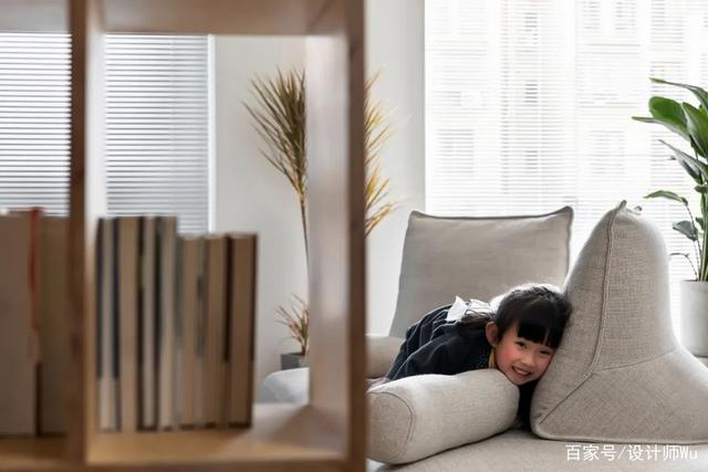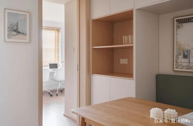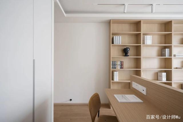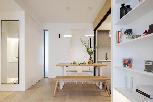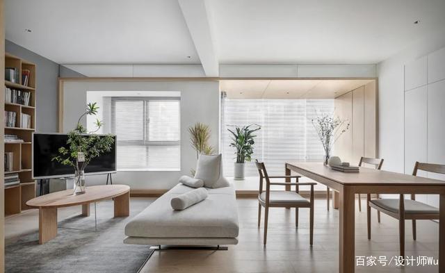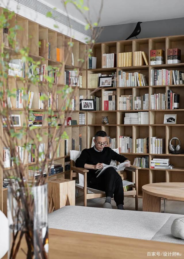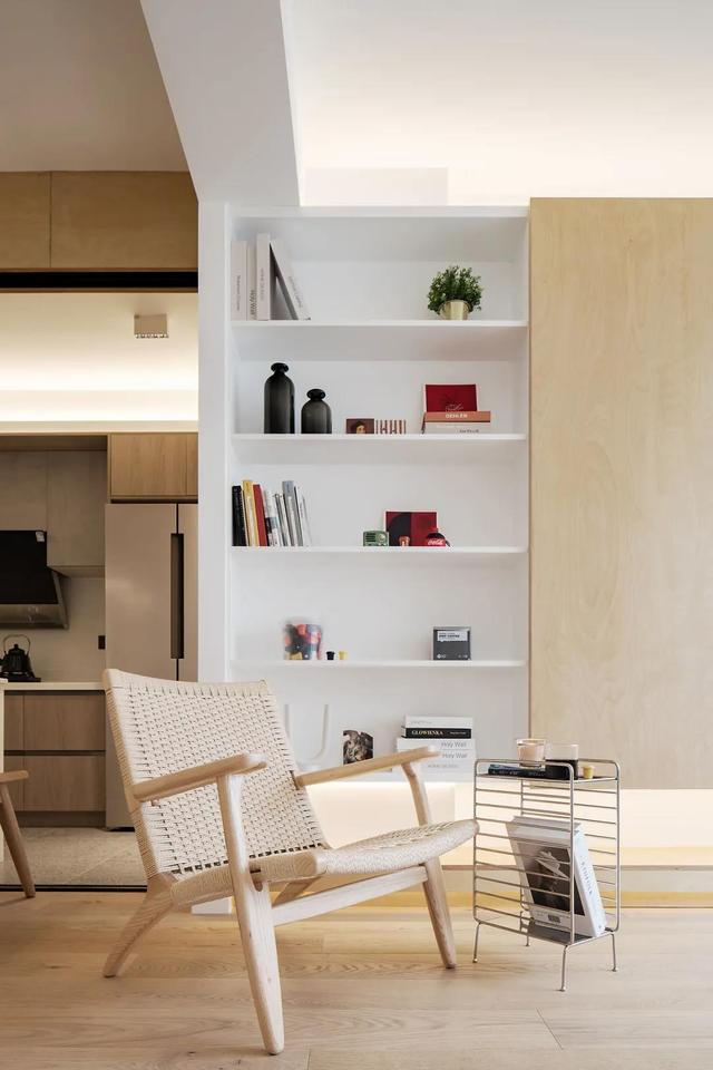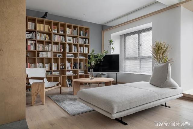 - 改变了客厅的进门方向,延伸玄关的视觉感受,使两个空间的联系更加紧密。 - 客厅  - 客厅南面拐角开窗,原结构较乱,利用框镜处理手法,顶部通过镜面反射,仿佛将木盒子植入空间。 - 客厅、餐厅和阳台之间的隔断拆除,将空间重新整合,开阔视觉感受。  - 客厅背景是一整面的书墙,电视不再是空间的主角,放在一旁,简约复古的造型为空间增色。  - 书的元素结合到整个空间,让客厅具有书房的功能属性,打开知识之门,诠释对生活的理解。  ▲ 画框电视 ▲ 画框电视- 原木色的空间主体,随处绿植的围绕,在光的映衬下,将空间更自然的划分,通透而富有艺术感。  - 简洁的白底色之中,增加了粗细均匀的曲直线条进行调节。设计在不同的空间切面中寻找向内联通的可能。  ▲ L型书架墙 ▲ L型书架墙- 书架做在楼梯的内侧,又与通透的客厅联通,接近图书馆的书架。  - 在这个空间里,没有一处不适合读书,也没有一处不适合交谈,在忙碌与来不及中破出一大片怡然声色。   ▲ 沙发背后是独立工作阅读区 ▲ 沙发背后是独立工作阅读区- 餐厅 - 餐厨沿线型延展出宽泛的范围,通透不被限定。