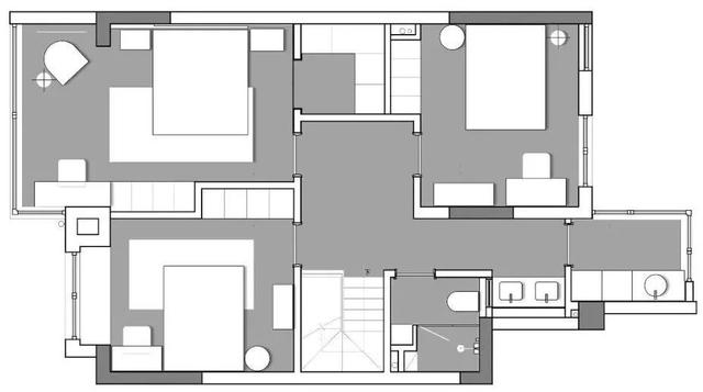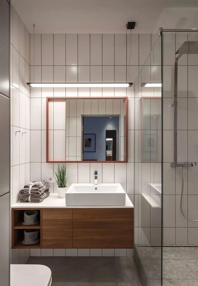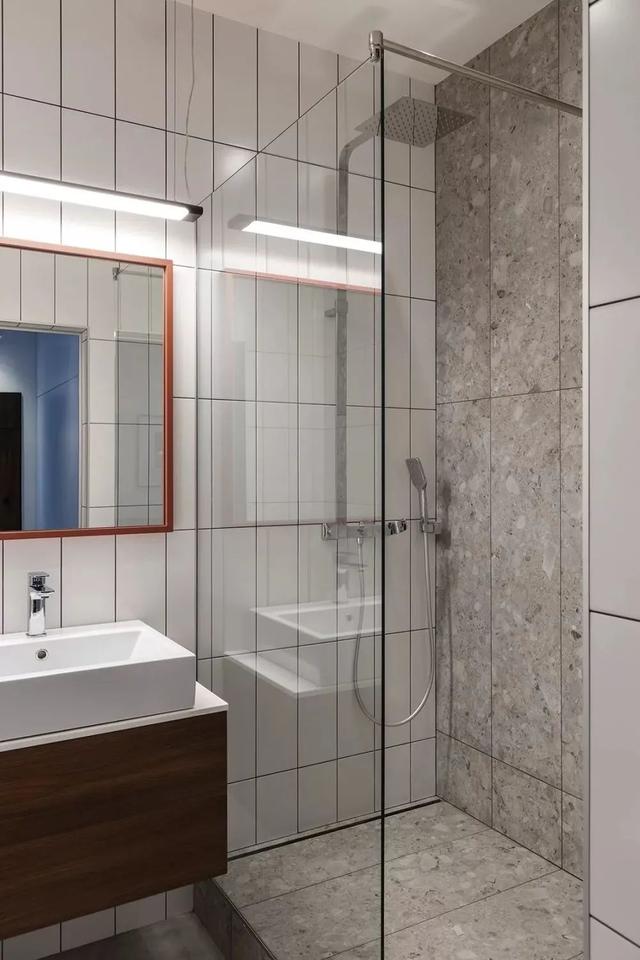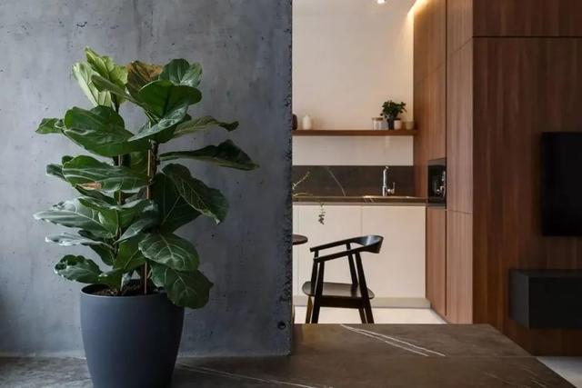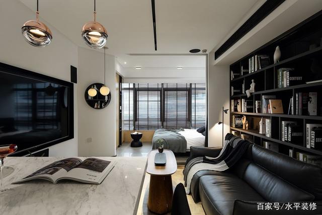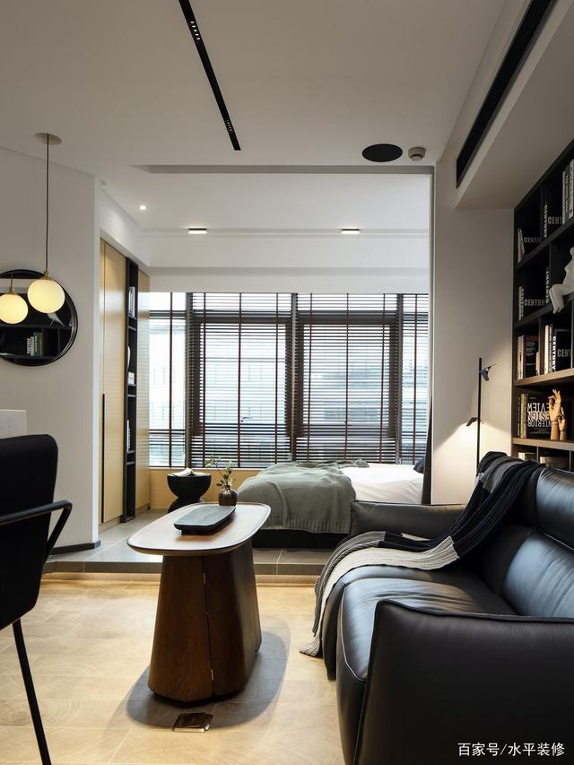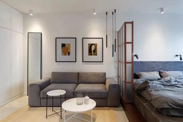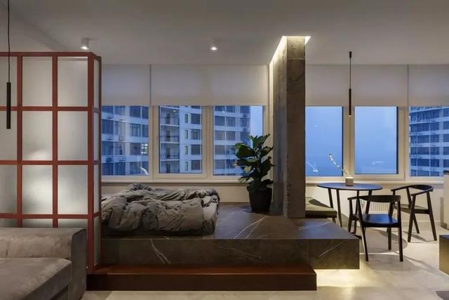 - ▲小公寓的面积不大,大门进来后的墙面以木饰面的墙面与电视墙练成一体,并在中间装上一扇隐形门,把卫生间藏在木饰面电视墙的后方,并在顶上装一排暗藏的灯带,让空间显得更加温馨精致有层次。  - ▲沙发墙挂上两幅装饰画,边上一面全身镜,搭配一套灰色布艺沙发+两张极简的圆茶几,整个空间显得简洁而优雅舒适。  - ▲客厅与卧室之间装上木框架的玻璃屏风,而卧室区域则是以抬高的定制地台床设计,带来一种全新的空间分界体验。 - 卧室  - ▲卧室区设在靠窗位置,以大理石质感的抬高地台床,整体现代优雅的质感,结合明亮通透的格局与采光,让小房子也住出了高品质的体验。  - ▲抬高的地台充当床,铺上灰色的床垫床单,床尾墙是水泥质感的墙体,墙体上还暗藏了灯带,增加了空间的明暗设计感,水泥墙后方就是餐厅区域,原始质感的加入现代风的设计,让空间充满自然舒适的生机气息。  - ▲餐厅与卧室区之间,一面毛坯质感的水泥墙,让空间感更加复古简约而高端。  - ▲在床尾角落处,挨着水泥墙摆一盆琴叶榕的盆栽,也让空间显得更加有生机与清晰气息。 - 餐厅  - ▲抬高地台也做成了餐厅的部分座位,布置圆餐桌与两张餐椅,餐桌上摆一个极简花瓶,插上插花,台面上方一束光线聚焦在餐台上,也让用餐空间显得温馨而舒适。  - ▲深木色的餐桌椅,搭配在简洁优雅的空间下,带来的感觉也是庄重也轻松。 - 厨房  - ▲侧边装上深木色的橱柜,收纳柜与电视墙练成一体,白色的橱柜+灰色操作台台面组合,操作台上方装一块搁板收纳架,也是营造出一种现代简约的烹饪体验。 - 卫生间  - ▲卫生间装上悬空设计的洗手盆,在木色的洗手盆柜上方装着台上盆的设计,灰色地面砖+白色墙面砖,墙面挂一面大尺寸的镜子,也是带来一个简约实用的卫浴空间。  - ▲淋浴房的地面砖与墙砖加入灰色水磨石的设计,让卫浴空间也呈现出一种复古调的文艺与简约气息。 - 平面布置图
